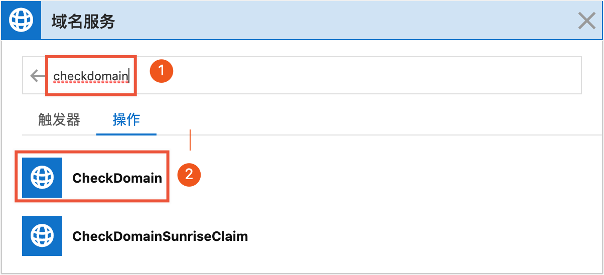 2. 在搜尋方塊內輸入checkdomain(圖示中①),單擊下方出現的CheckDomain操作(圖示中②)。