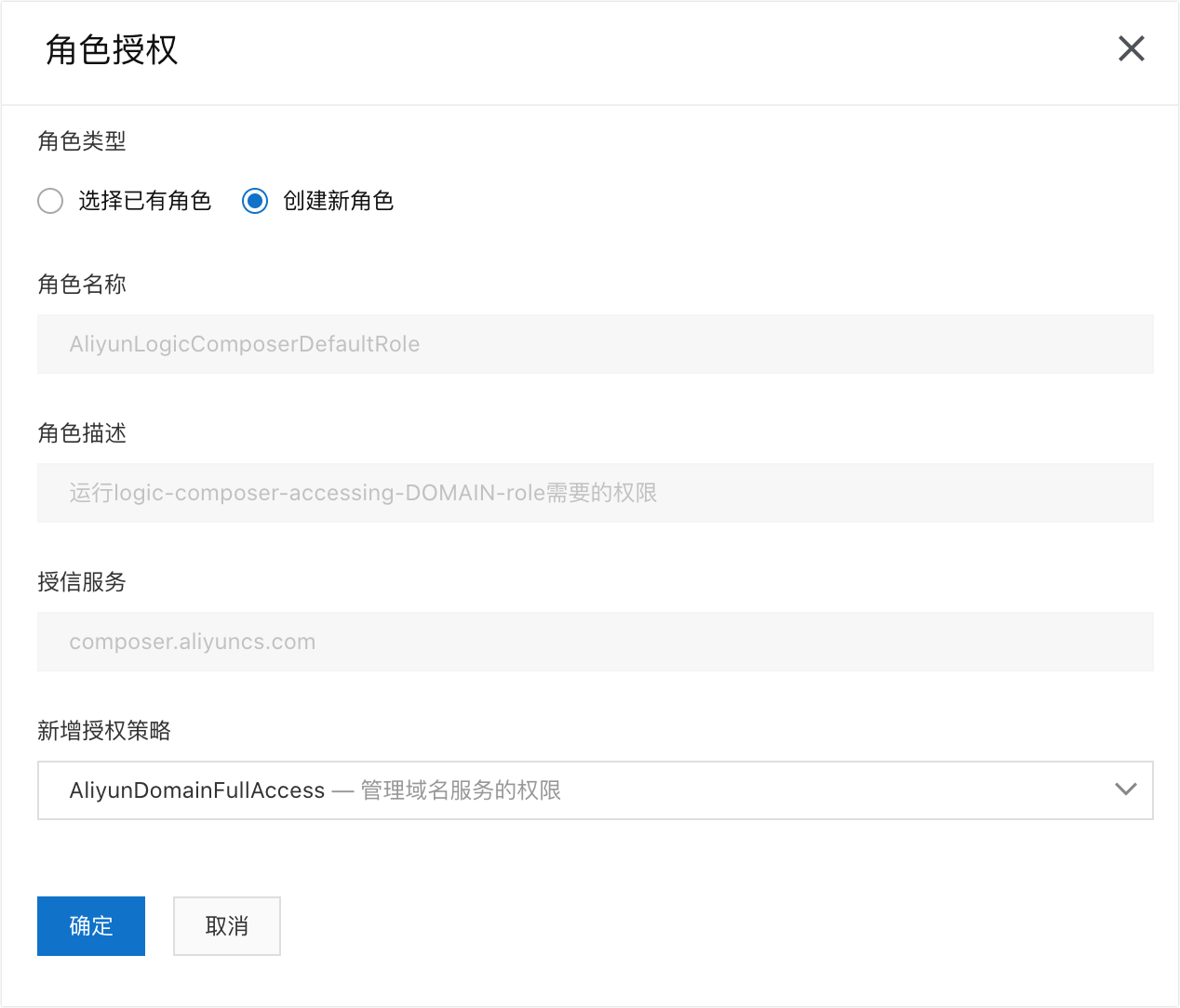 3. 如果您從未使用邏輯編排服務,此時會出現一個授權按鈕,因為邏輯編排工作流程在運行過程中,需要扮演您的某個RAM角色,訪問您的API,所以需要授權邏輯編排一個正確的RAM角色才能保證工作流程正常運行。單擊授權按鈕,彈出授權對話方塊。該對話方塊內顯示了即將建立的RAM角色名稱和角色描述,以及即將新增的授權策略。這裡邏輯編排根據您需要添加的操作自動推薦了合適的系統許可權,單擊確定完成授權。