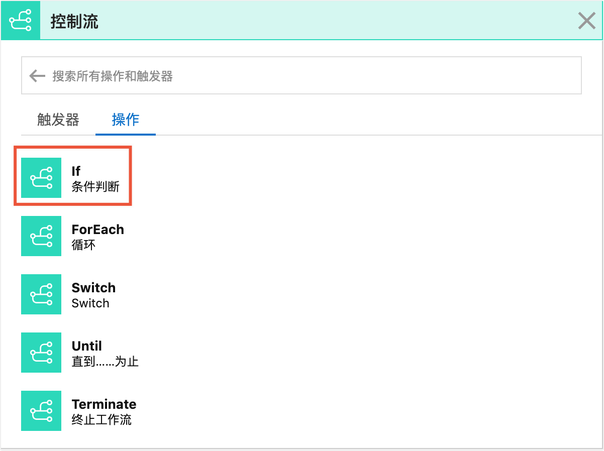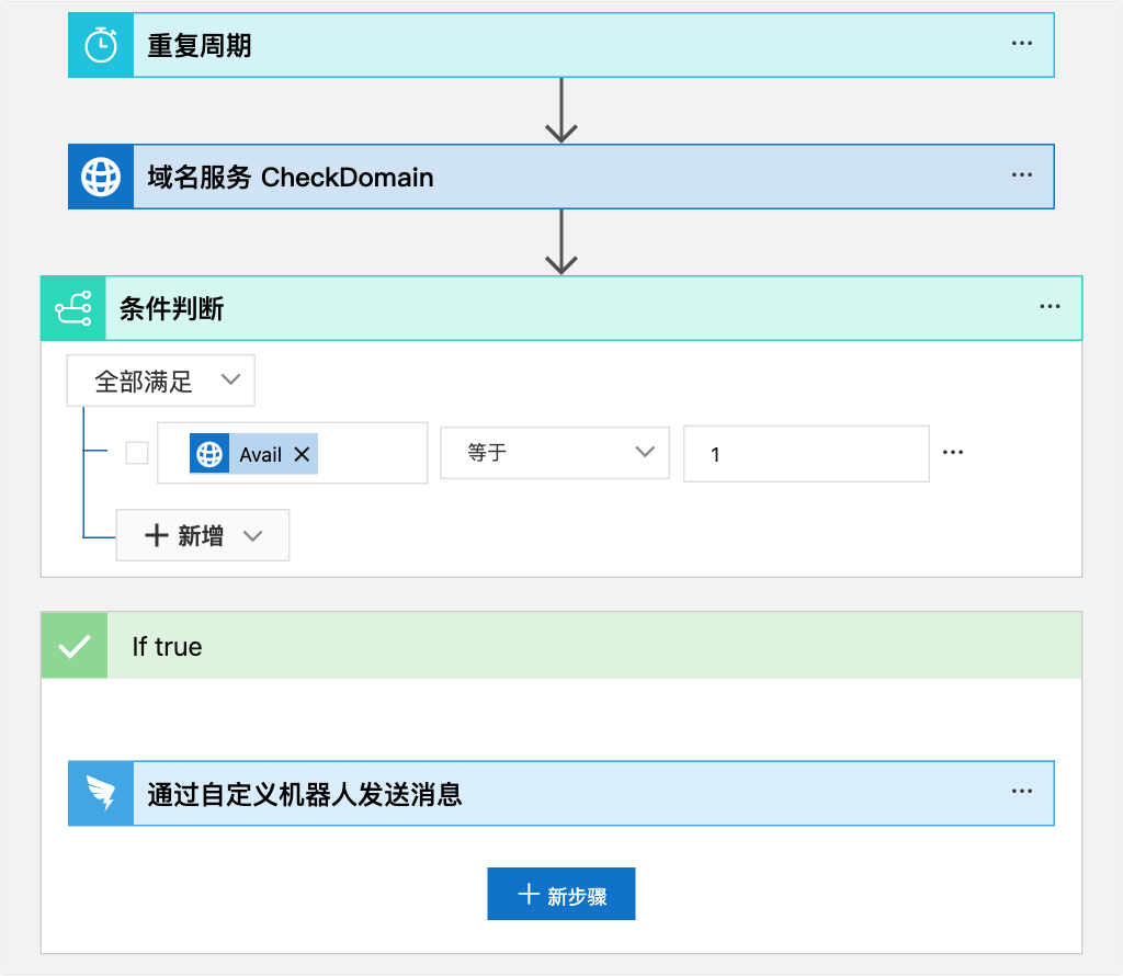 5. 接下來我們需要判斷該網域名稱是否可以註冊,我們需要添加一個條件判斷的操作。方法和上述添加檢查網域名稱的操作類似。滾動到可視化編輯器的底部,在最下方單擊新步驟按鈕,選擇控制流程連接器,再選擇If(條件判斷)操作。