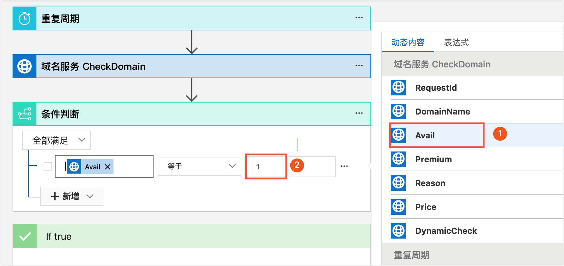 6. 該連接器不需要身分識別驗證。接下來我們完善條件判斷裡的邏輯。經過閱讀CheckDomain文檔,該API返回結果中,Avail可以用來判斷網域名稱是否可以註冊。Avail有多種取值,其中,1表示可以註冊,那我們這裡的判斷邏輯就是Avail等於1。單擊條件判斷的左側的輸入框,此時輸入框右側會出現動態內容彈框,裡面展示了當前步驟可以擷取到的值。點擊動態內容彈框內的Avail(圖示中①),則該值會自動填入到左側輸入框內。在右側輸入框內填入判斷的值1(圖示中②)。
