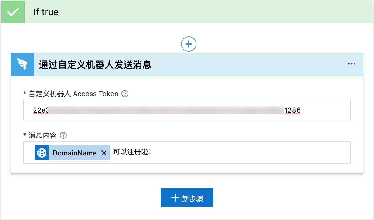 7. 接下來我們需要在滿足條件的情況下添加執行通知的操作。單擊If true裡面的新步驟按鈕,再單擊DingTalk連接器,選擇通過自訂機器人發送訊息操作。這裡需要填寫您DingTalk自訂機器人的AccessToken,首先參照DingTalk文檔擷取自訂機器人的WebHook地址,並取出該地址中access_token參數的值進行填寫。訊息內容可以根據自己的需要進行填寫,同時可以選取右側動態內容中的某一個值,比如