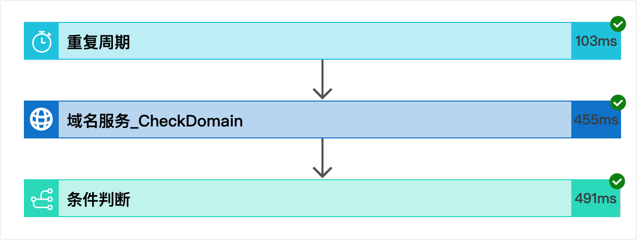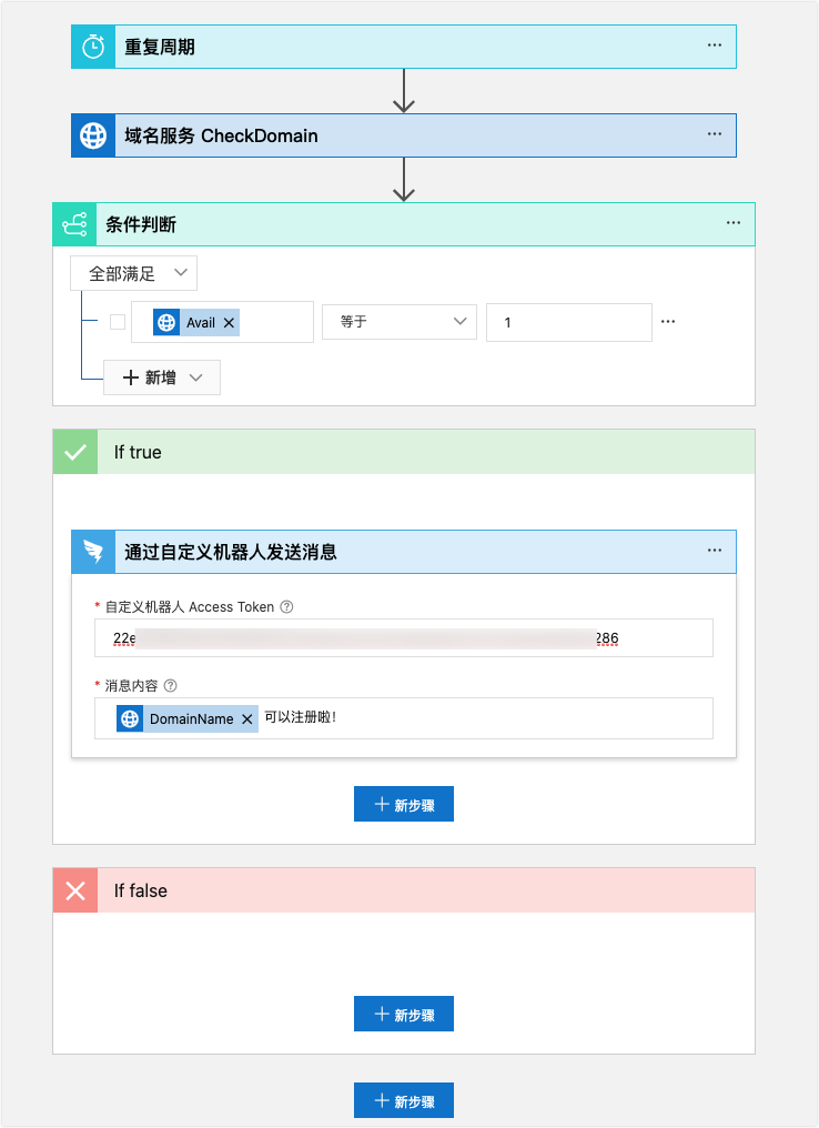 在本樣本中,構建一個自動化工作流程,每天定時檢查某個網域名稱是否可以註冊,如果可以註冊,則向您的一個DingTalk群發送提醒。最終構建的工作流程如下: