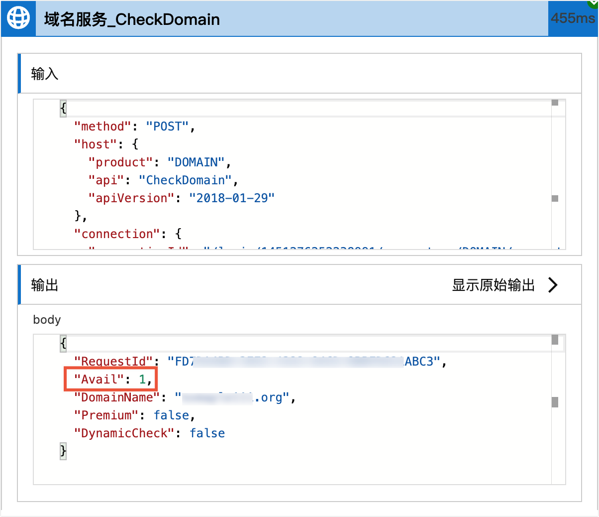 3. 單擊每一步均可以看到該步驟運行過程中的輸入和輸出,比如,單擊網域名稱服務 (DNS)_CheckDomain這個步驟,可以看到輸出結果的Avail值為1,表示該網域名稱可以註冊。