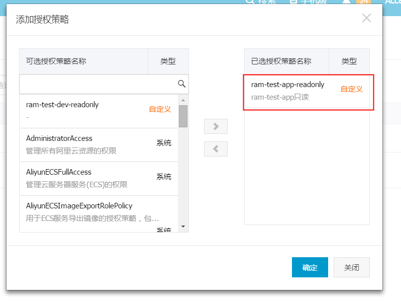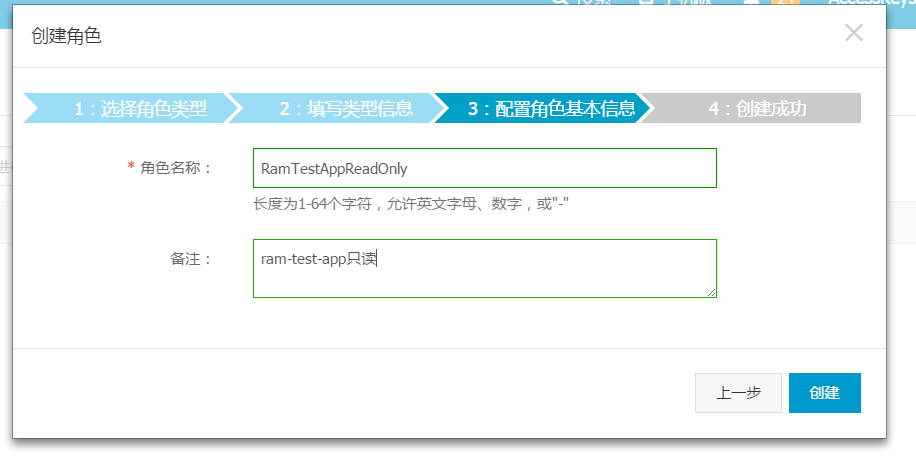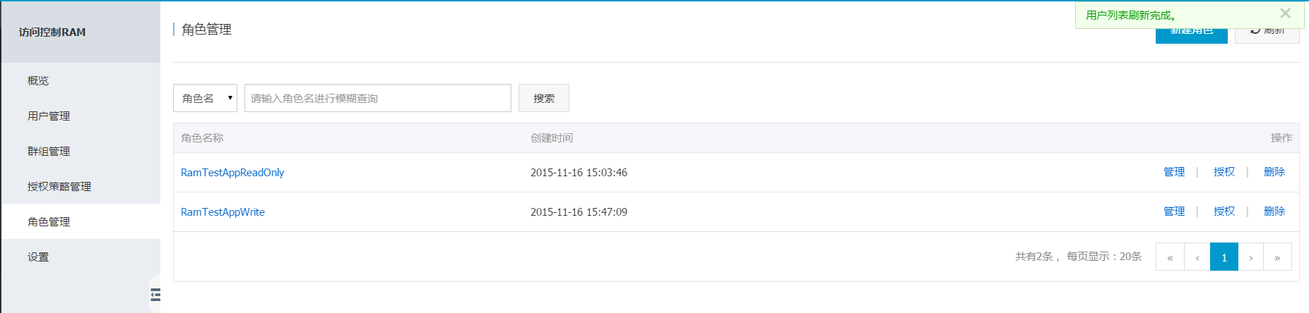 { "Version": "1", "Statement": [ { "Effect": "Allow", "Action": [ "oss:DeleteObject", "oss:ListParts", "oss:AbortMultipartUpload", "oss:PutObject" ], "Resource": [ "acs:oss:*:*:ram-test-app", "acs:oss:*:*:ram-test-app/*" ] } ] }目前建立的兩個角色為:RamTestAppReadOnly和RamTestAppWrite,分別表示了對於ram-test-app的讀寫權限。