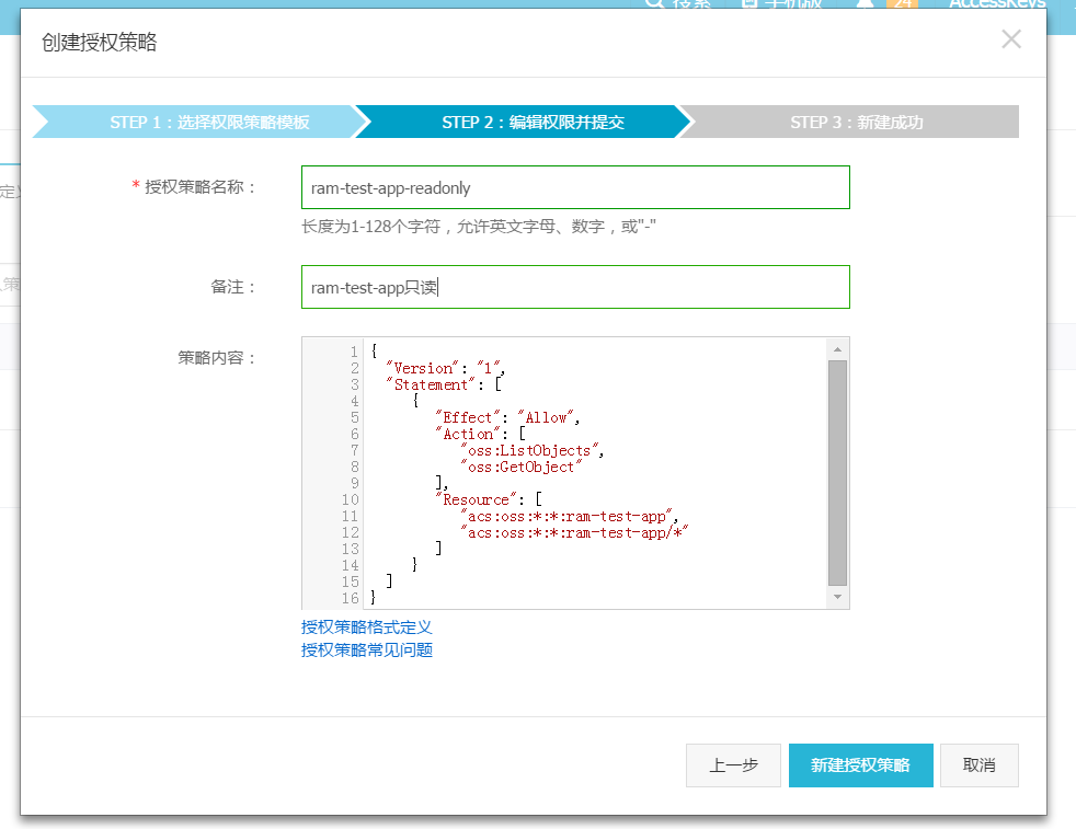 { "Version": "1", "Statement": [ { "Effect": "Allow", "Action": [ "oss:ListObjects", "oss:GetObject" ], "Resource": [ "acs:oss:*:*:ram-test-app", "acs:oss:*:*:ram-test-app/*" ] } ] }表示對ram-test-app擁有隻讀許可權。
