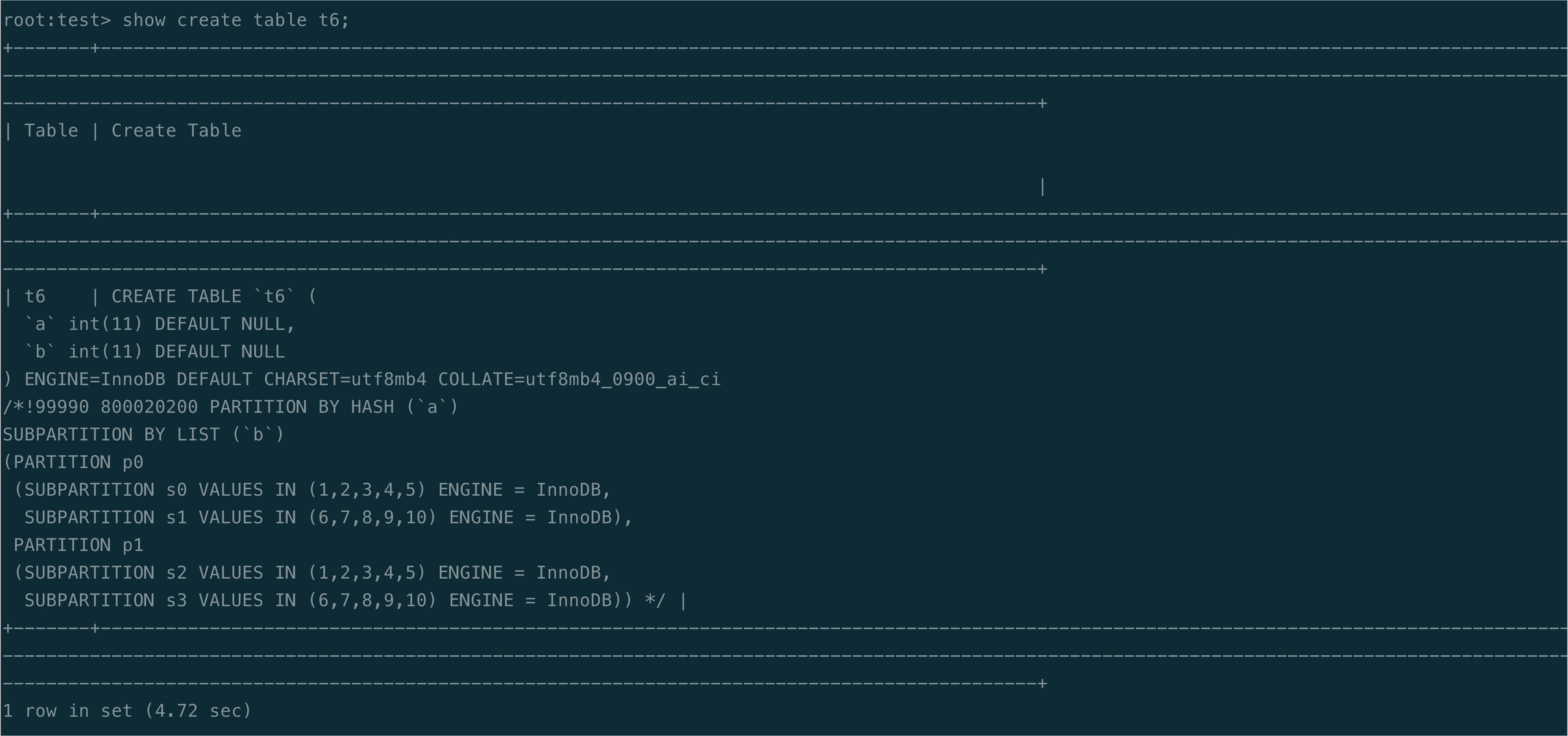 CREATE TABLE `t1` (c1 int, KEY(c1) GLOBAL) ENGINE=InnoDB PARTITION BY HASH (`c1`) PARTITIONS 4; Query OK, 0 rows affected (0.06 sec) SHOW CREATE TABLE t1; +-------+----------------------------------------------------------------------------------------------------------------------------------------------------------------------------------------------------------------------+ | Table | Create Table | +-------+----------------------------------------------------------------------------------------------------------------------------------------------------------------------------------------------------------------------+ | t1 | CREATE TABLE `t1` ( `c1` int(11) DEFAULT NULL, KEY `c1` (`c1`) /*!99990 800020207 GLOBAL */ ) ENGINE=InnoDB DEFAULT CHARSET=utf8mb4 COLLATE=utf8mb4_0900_ai_ci /*!50100 PARTITION BY HASH (`c1`) PARTITIONS 4 */ |