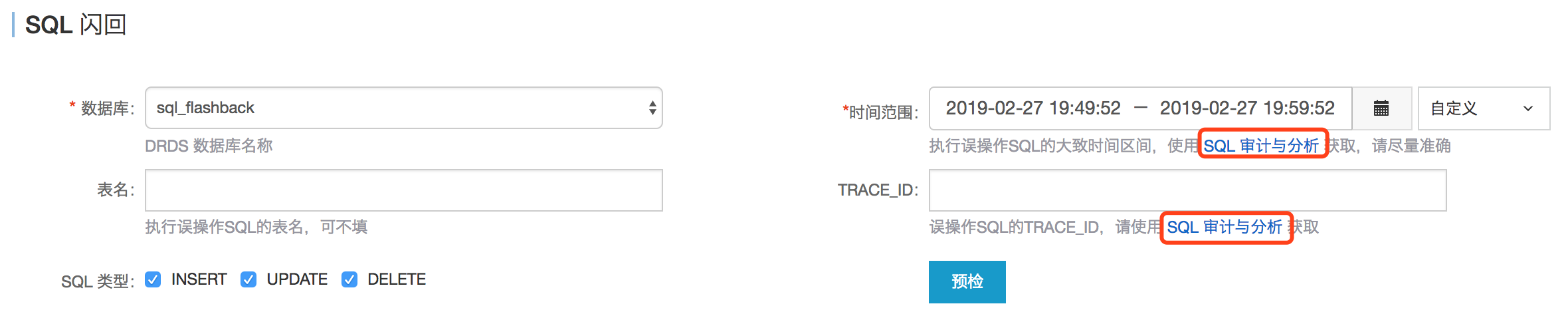 按照操作提示,填寫誤操作SQL的基本資料,包括資料庫、誤操作SQL執行的時間範圍、表名、TRACE_ID,SQL類型。關於如何擷取誤操作SQL的相關資訊,請參見定位誤操作SQL。