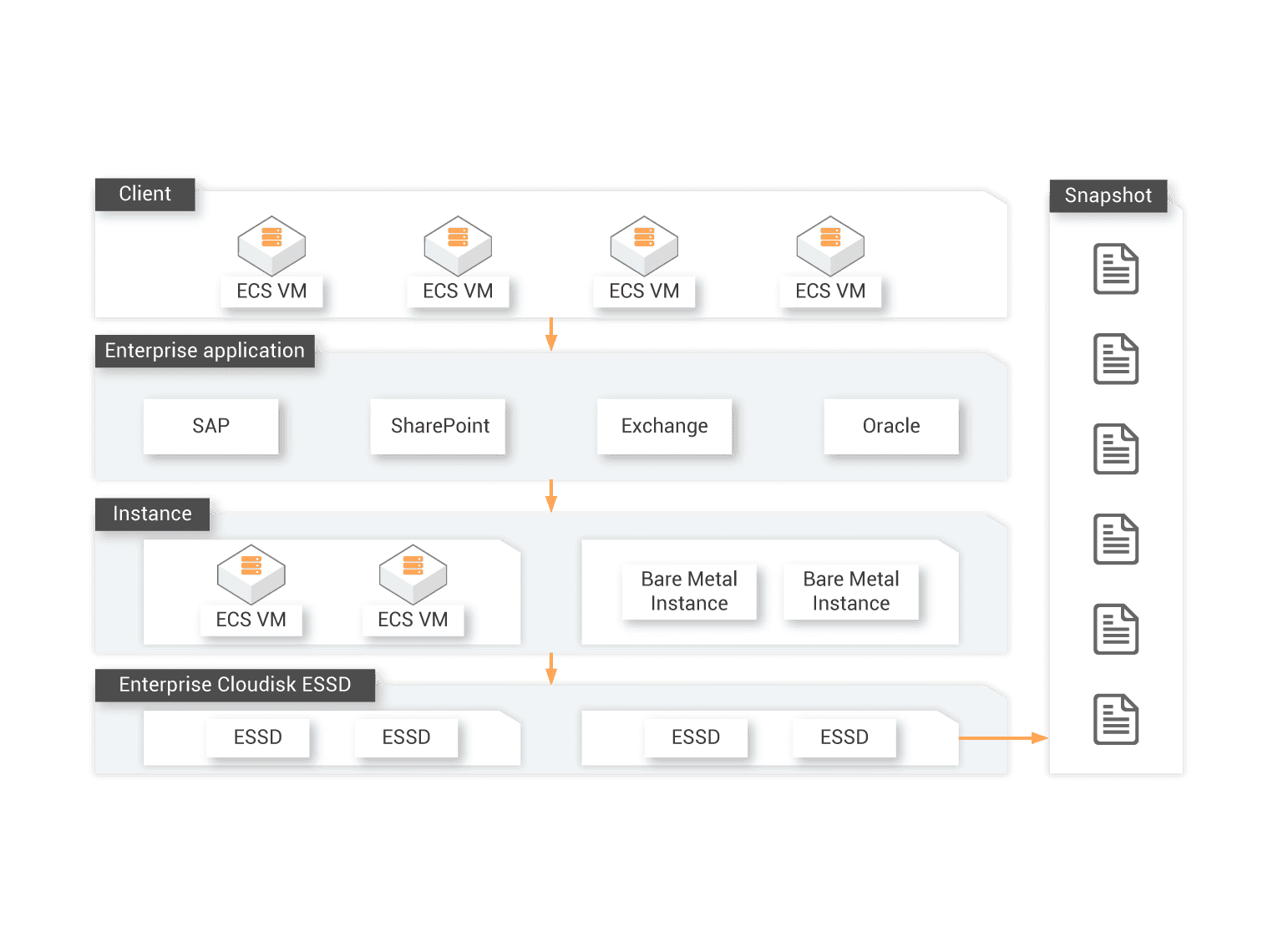 Enables simple and efficient data backup based on snapshots. You can meet industry compliance requirements by using the Bring Your Own Key (BYOK) model to encrypt data in disks.