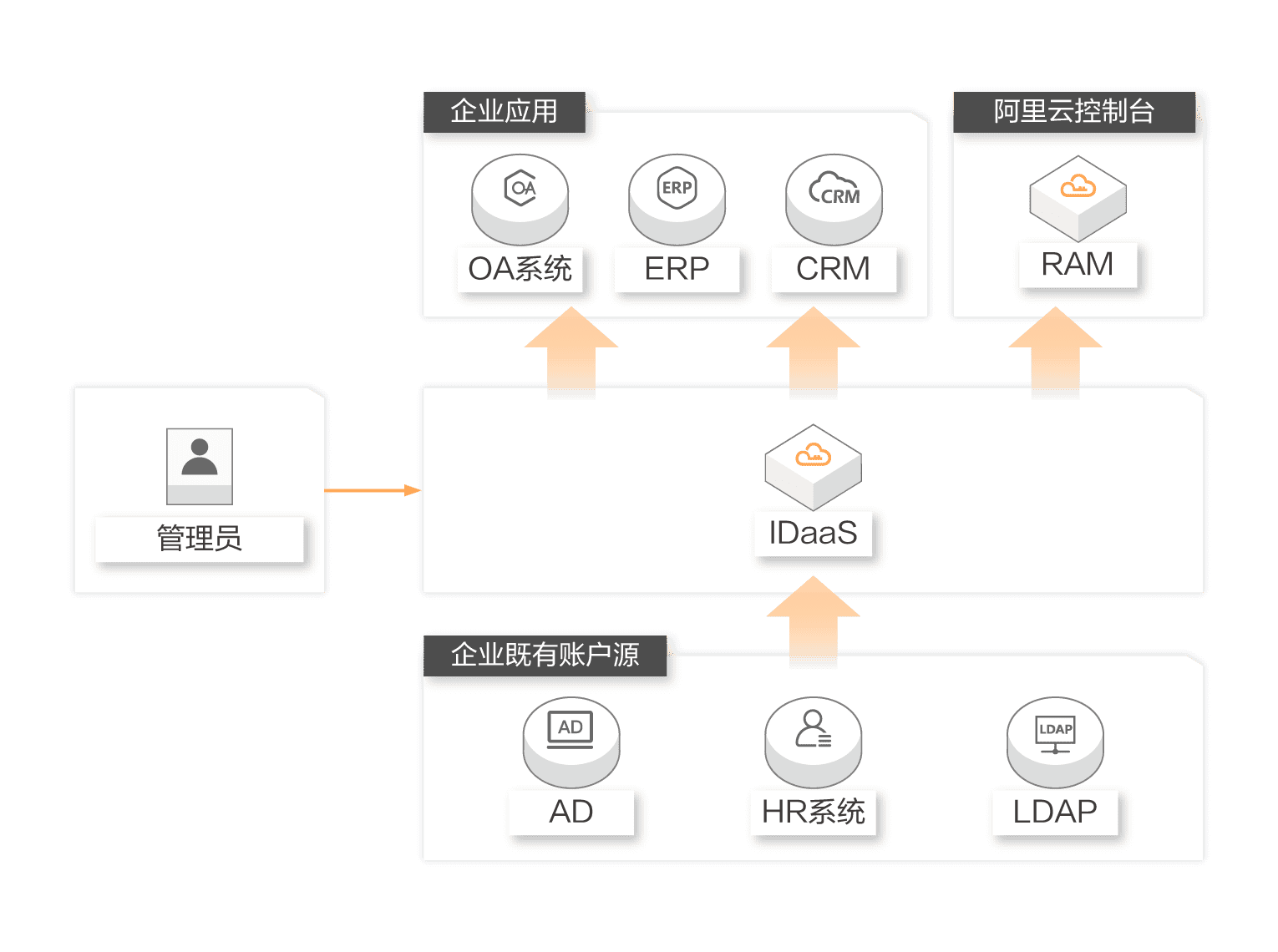 跨云平台的身份连接——IDaaS可以充当其他云平台身份连接到阿里云的桥梁。 云身份管理解决方案通常是企业涉足云服务的基本要求, IDaaS可以在阿里云和私有环境之间以及多个公共云提供商之间建立身份桥梁。