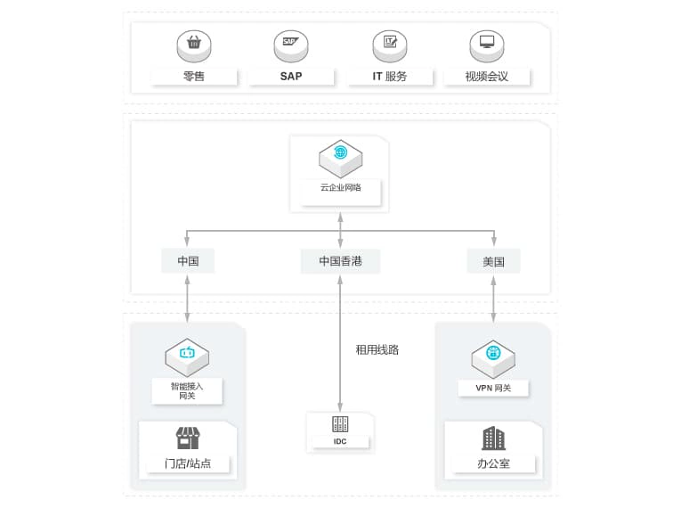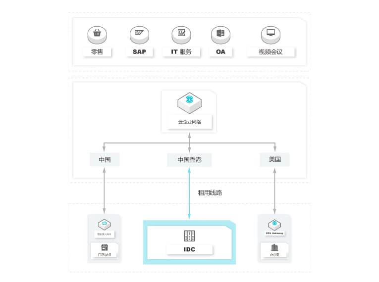 无论是任何行业,阿里云混合云网络解决方案能够将您的 IDC、总部、分支机构或线下商店的本地数据连接到阿里云。混合网络连接可确保您的跨区域互连安全、可靠且灵活。