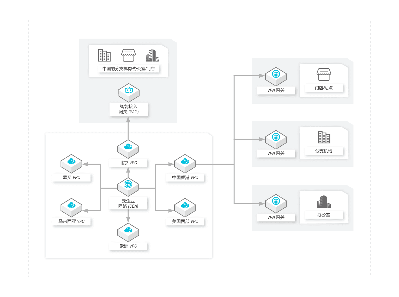 VPN 网关用于通过外网在阿里云 VPC 与企业数据中心、企业办公网络或外网平台之间传输加密流量。
